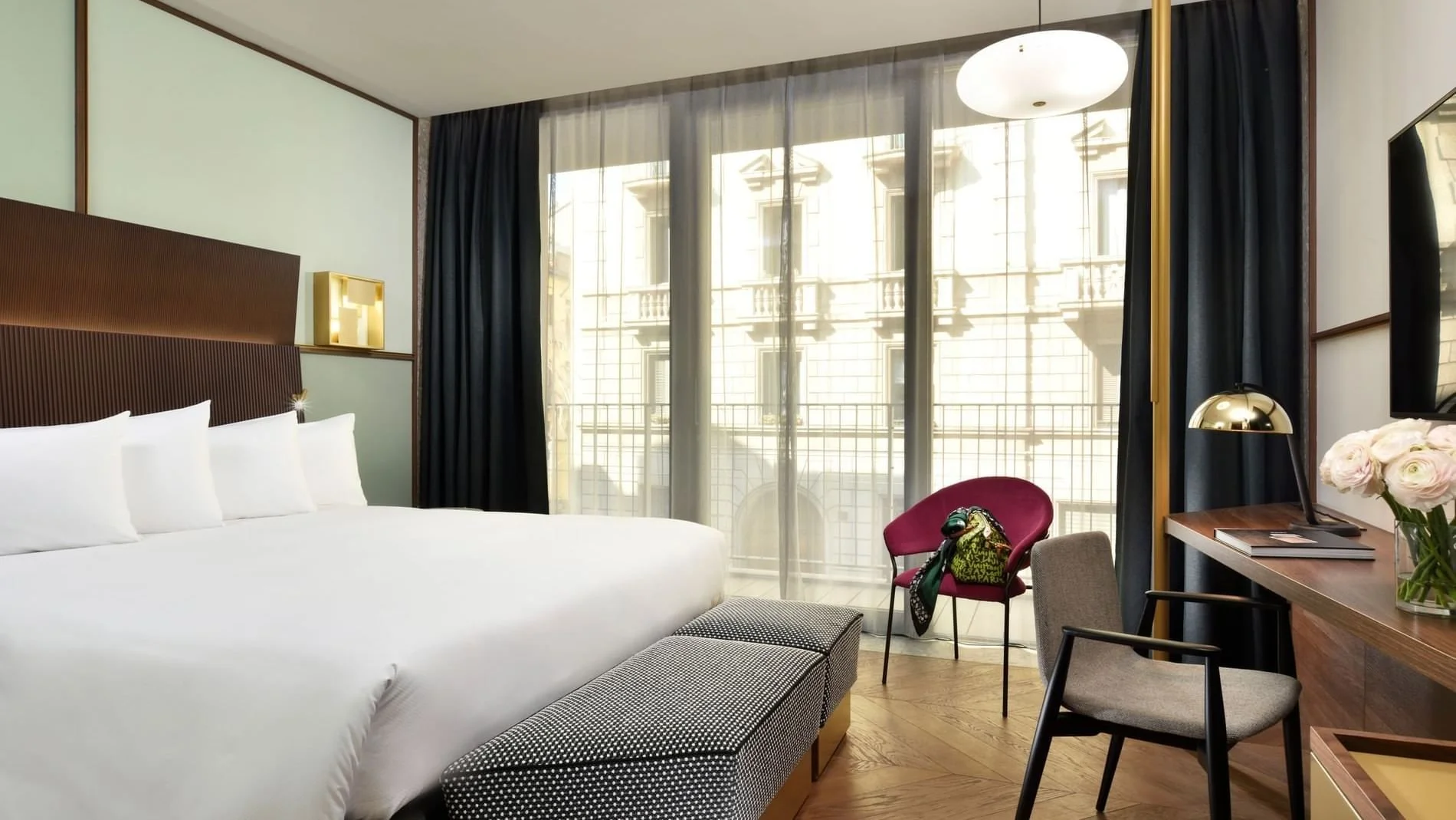 22-24 m² rooms, with parquet flooring throughout, and 180 cm double bed or 90 cm twin beds. Deluxe rooms have a balcony, or tall, large windows, making them very bright. With air-conditioning, mini-bar, safe, desk, phone, 55" Smart TV with satellite channels and screen mirroring system, and free Wi-Fi. The bathroom features a large shower, make-up/shaving mirror, hairdryer and complimentary toiletries.